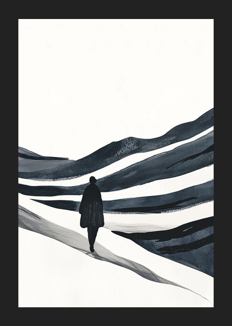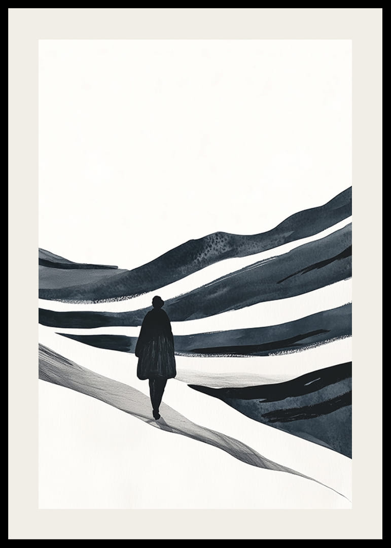 Entdecken Sie das magische Gefühl der Einsamkeit und Ruhe, das dieses Poster durchdringt. Es zeigt einen einsamen Wanderer, umgeben von einer weiten, eisigen Landschaft, mit geschwungenen Linien, die ein Gefühl von Unendlichkeit und Freiheit vermitteln.