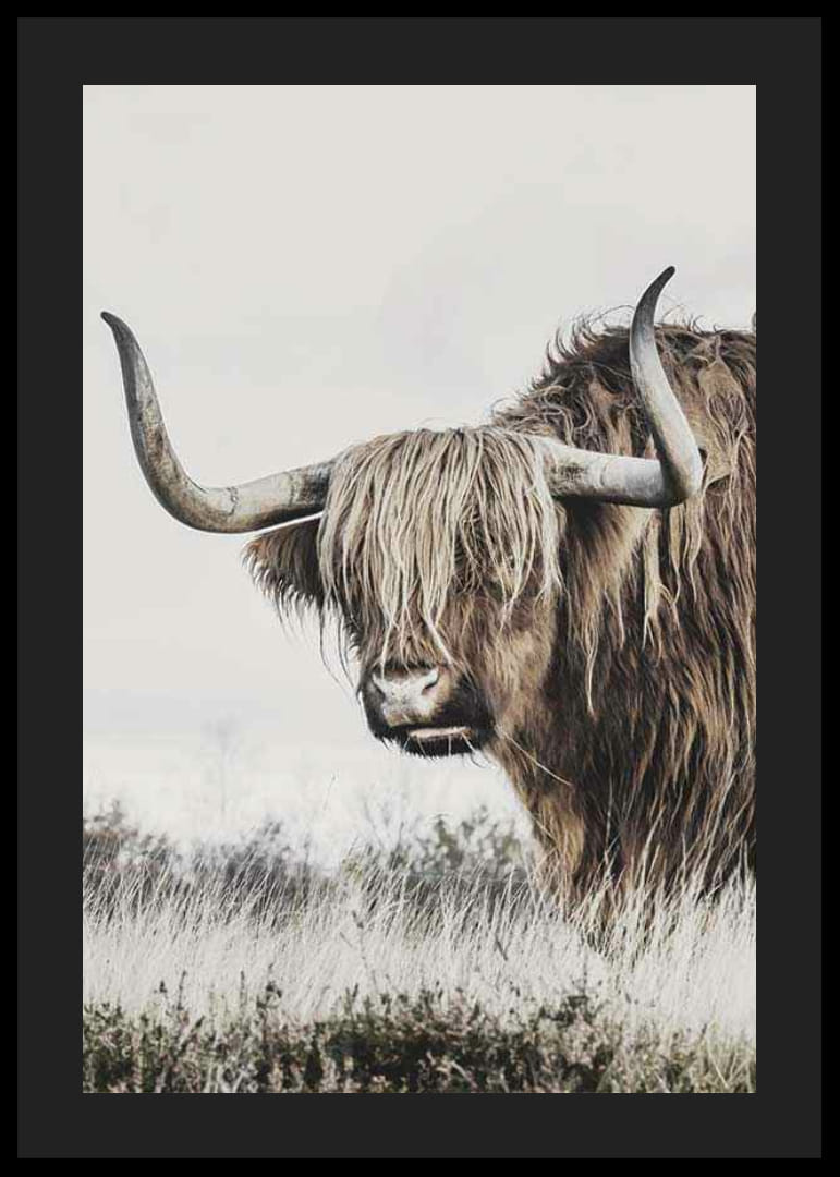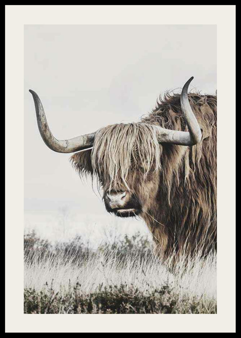 Nahaufnahme eines Hochlandrinds mit langem, welligem Fell und charakteristischen, geschwungenen Hörnern. Das Motiv ist in natürlichem Licht mit sanften, gedämpften Erdtönen vor einem schlichten Hintergrund eingefangen. Dieses Poster vermittelt nordisches Flair und verleiht sowohl dem Wohnzimmer als auch dem Arbeitszimmer eine rustikale, friedliche Note.