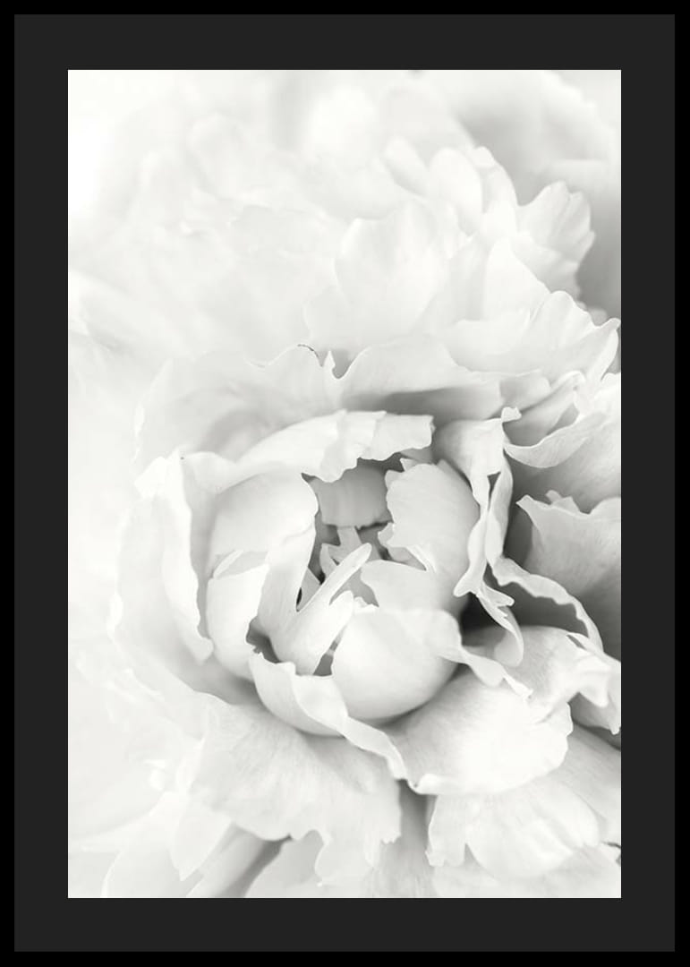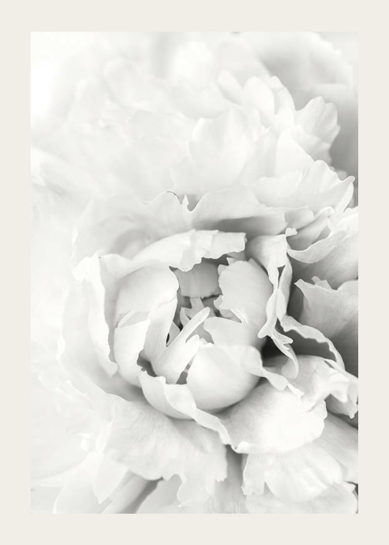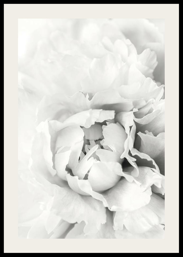 Eine Nahaufnahme einer weißen Pfingstrose, deren weiche, gefaltete Blütenblätter die gesamte Fläche einnehmen und einen leichten und luftigen Ausdruck erzeugen. Die dezenten Weiß- und Grautöne verleihen dem Motiv eine ruhige und zeitlose Ausstrahlung. Der fotografische Stil macht dieses Poster zu einer stilvollen Ergänzung für Schlafzimmer und Wohnzimmer.