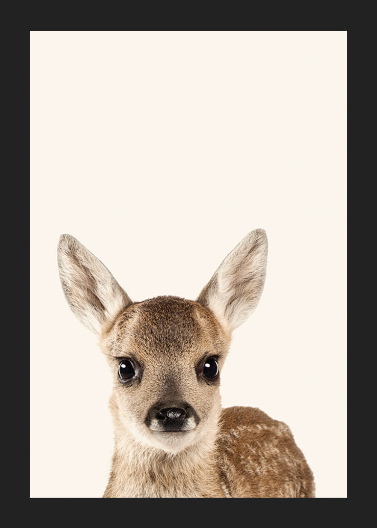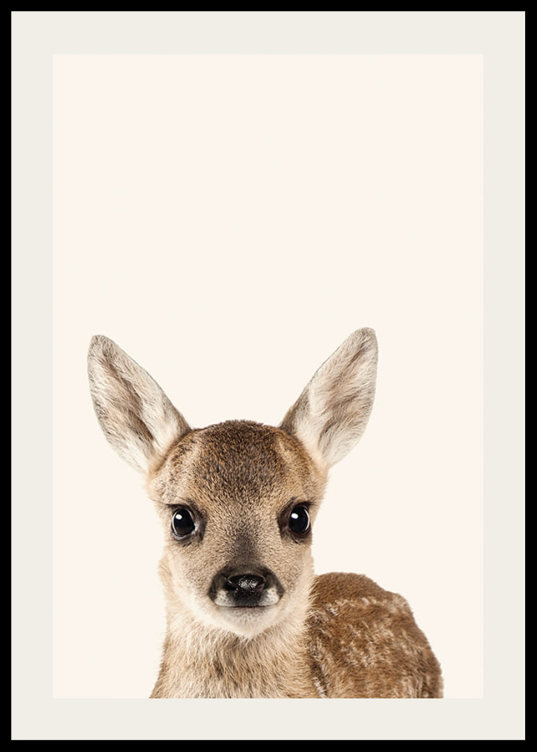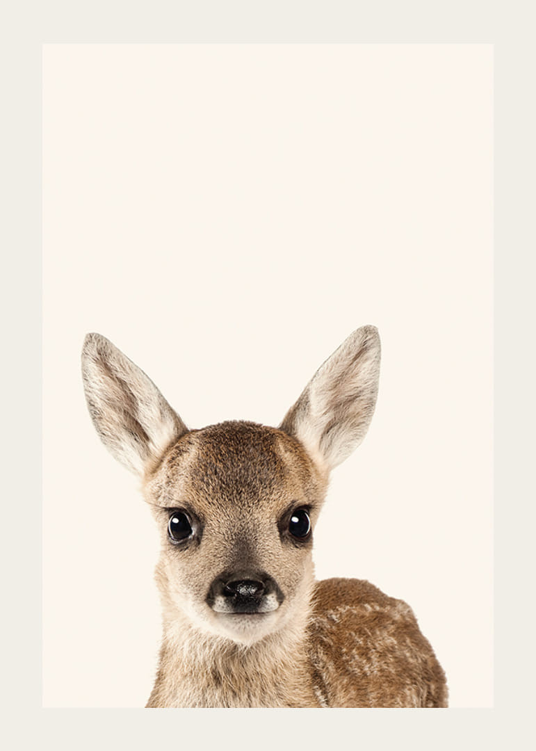 Nahaufnahme eines jungen Hirschkalbs mit großen, dunklen Augen und weichem, braunem Fell mit hellen Flecken. Das Motiv hat einen hellbeigen Hintergrund, der das Gesicht und den Ausdruck des Tieres hervorhebt. Das stilvolle Poster passt gut in Kinderzimmer oder andere Umgebungen, in denen eine natürliche und freundliche Atmosphäre gewünscht ist.