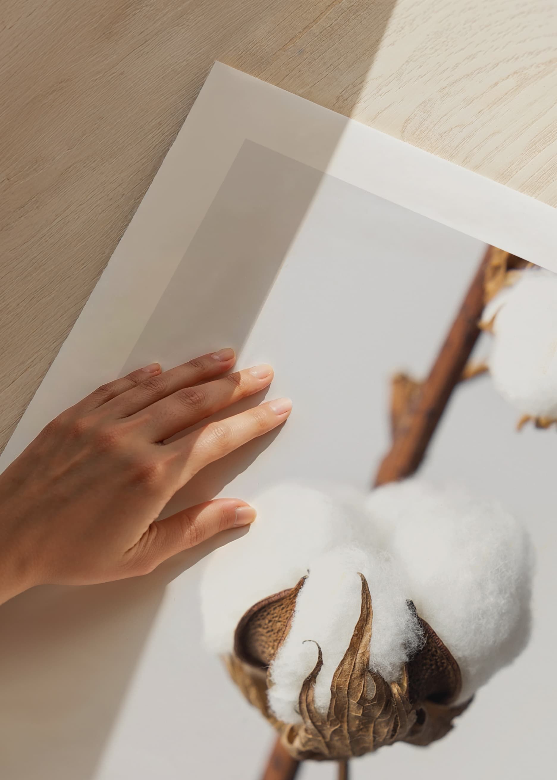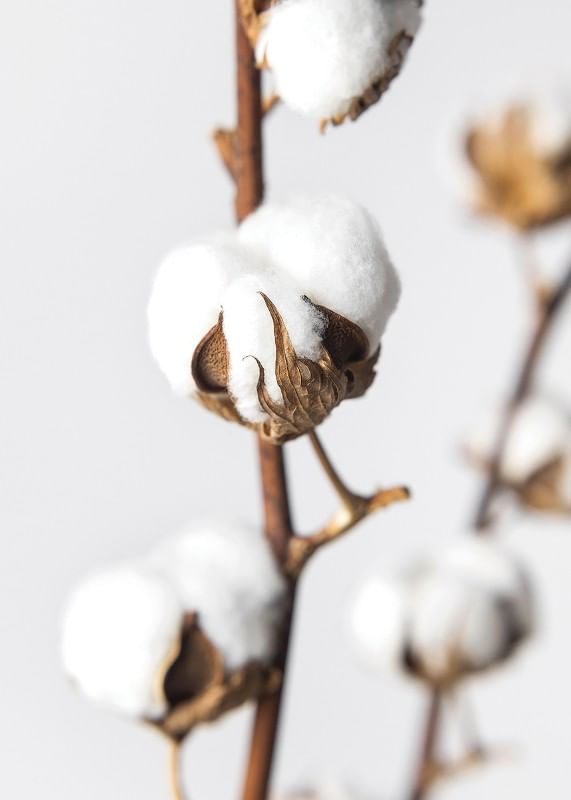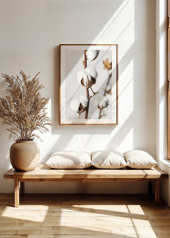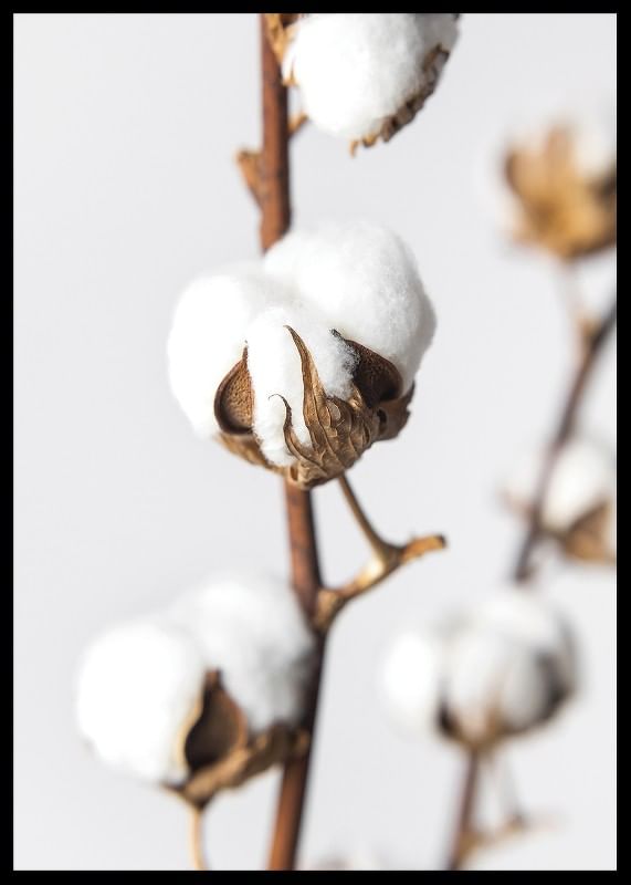 Nahaufnahme von Wattebällchen auf braunen Stielen, deren weiße, flauschige Fasern sich deutlich vom hellgrauen Hintergrund abheben. Das Motiv fängt die natürliche Struktur und den schlichten Ausdruck der Pflanze ein und verleiht dem Raum eine leichte und natürliche Atmosphäre. Dieses Poster eignet sich beispielsweise hervorragend für Schlafzimmer oder Wohnzimmer.