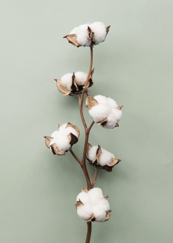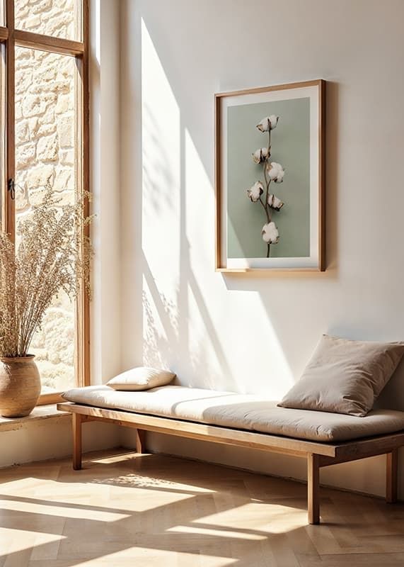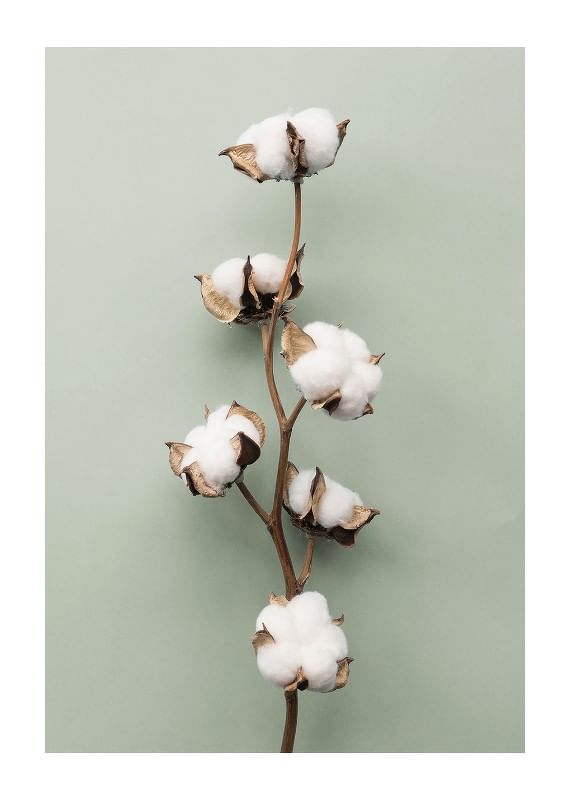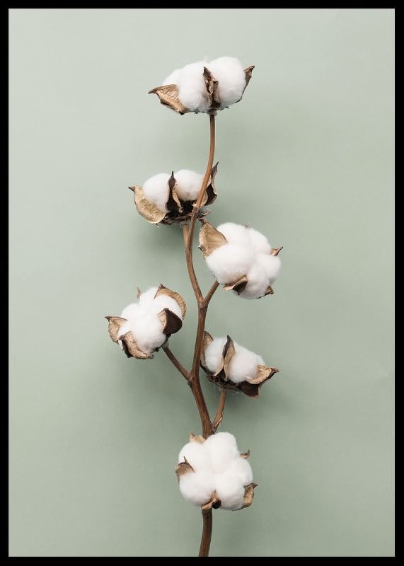Eine stilvolle Komposition mit Baumwollzweigen in Nahaufnahme, bei der die weißen, flauschigen Kugeln mit den braunen Kapseln kontrastieren. Der hellgrüne, einfarbige Hintergrund verleiht dem Motiv einen frischen Ausdruck und hebt die natürlichen Formen hervor. Dieses botanische Poster setzt ein ruhiges Element in jedem Raum, vom Wohnzimmer bis zum Schlafzimmer.
