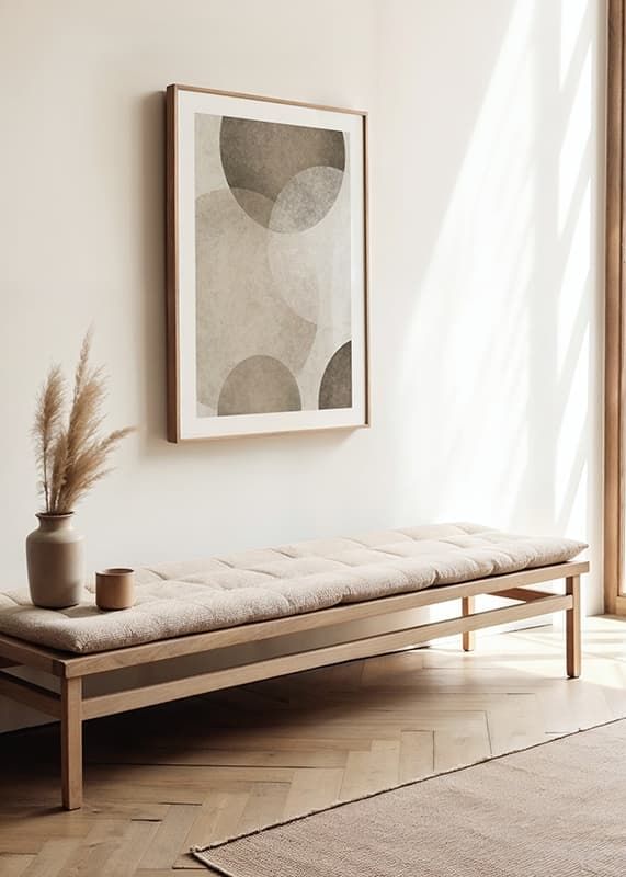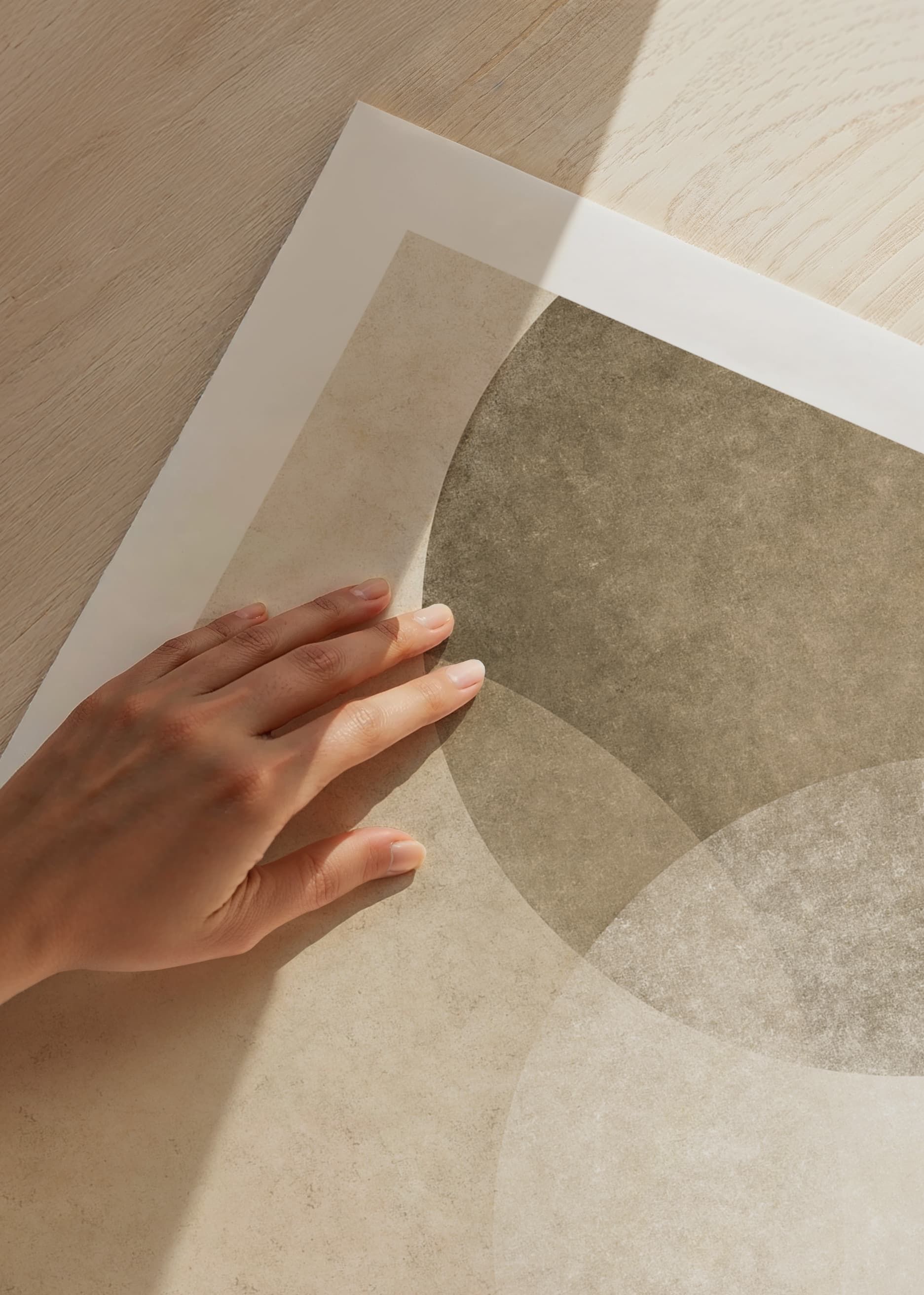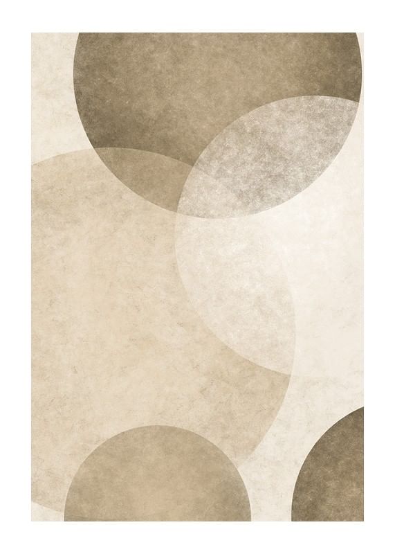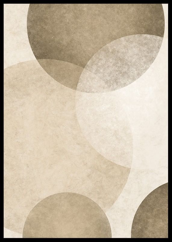 Weiche, sich überlappende Kreise in verschiedenen Beige- und Brauntönen bilden ein harmonisches abstraktes Muster. Die transparenten Schichten erzeugen subtile Nuancen und Tiefe. Dieser künstlerische Ausdruck trägt zu einer ruhigen und zeitlosen Atmosphäre bei und macht das Poster sowohl für Wohn- als auch für Arbeitszimmer geeignet.