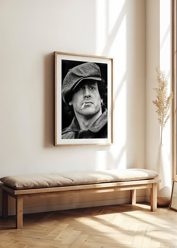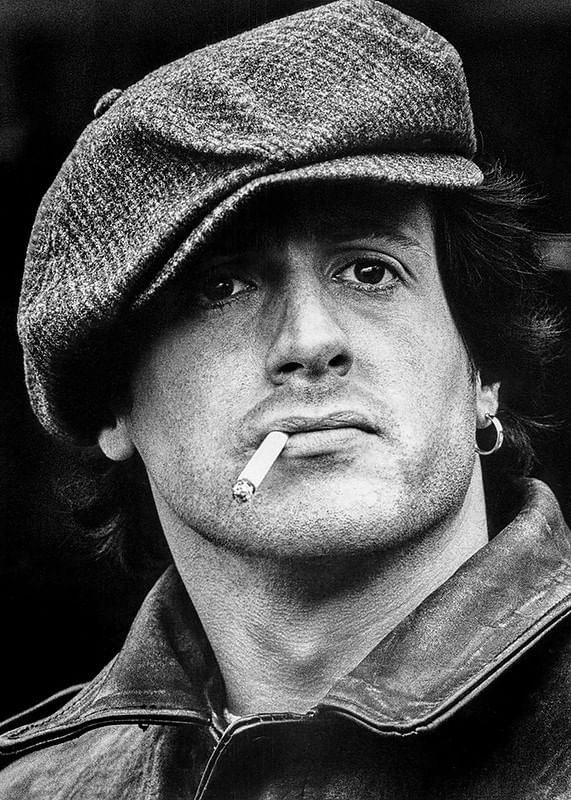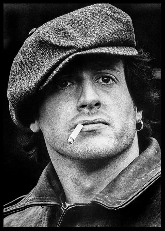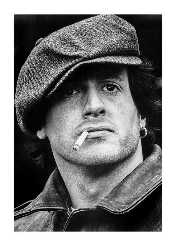 Poster mit einer Schwarz-Weiß-Fotografie des amerikanischen Schauspielers Sylvester Stallone aus dem Jahr 1978. Das Foto hat eine alte und körnige Struktur, die dem Bild einen zeitgenössischen Vintage-Look verleiht. Diese Vintage-Fotografie gehört zu unserer Sammlung ikonischer Fotografien von Prominenten.