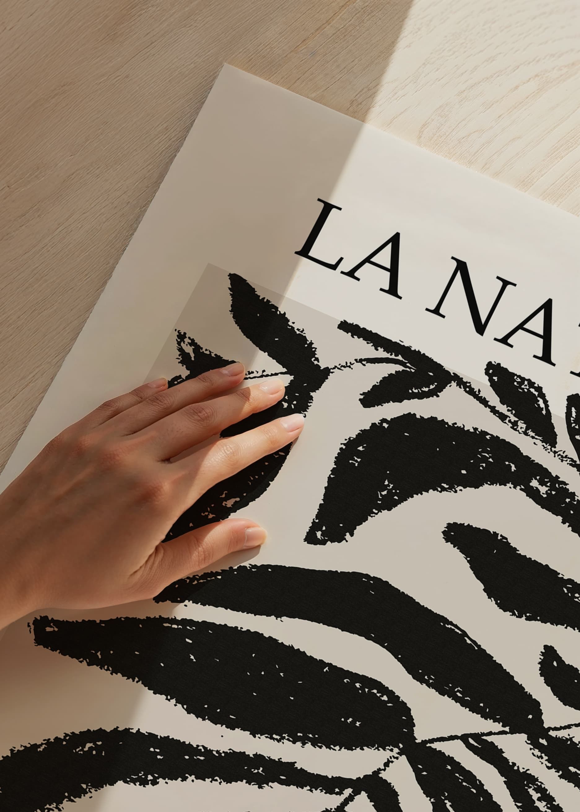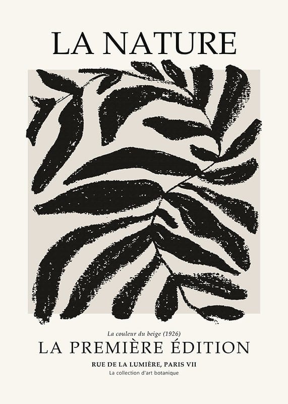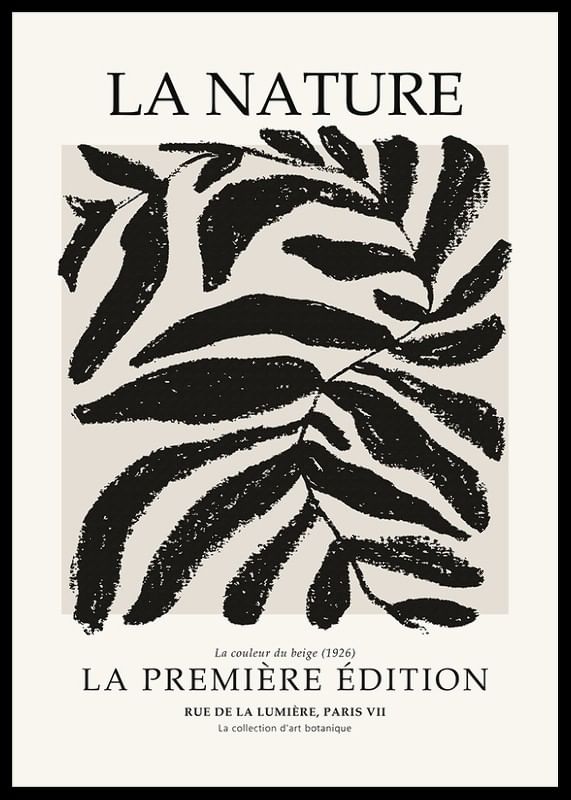 Das Motiv besteht aus einem stilisierten schwarzen Zweig mit breiten Blättern vor einem sandfarbenen, einfarbigen Hintergrund. Darüber steht in großen Buchstaben der Text „La Nature“, während der untere Teil mit französischen Textelementen verziert ist, die an botanische Sammlungen erinnern. Dieses Poster vermittelt ein grafisches Gefühl, das sowohl in moderne als auch in klassische Einrichtungen gut passt.