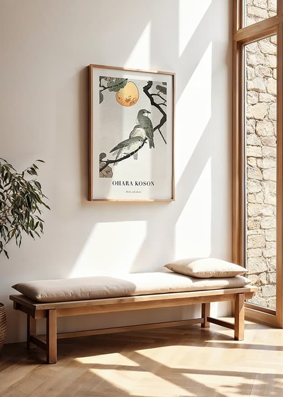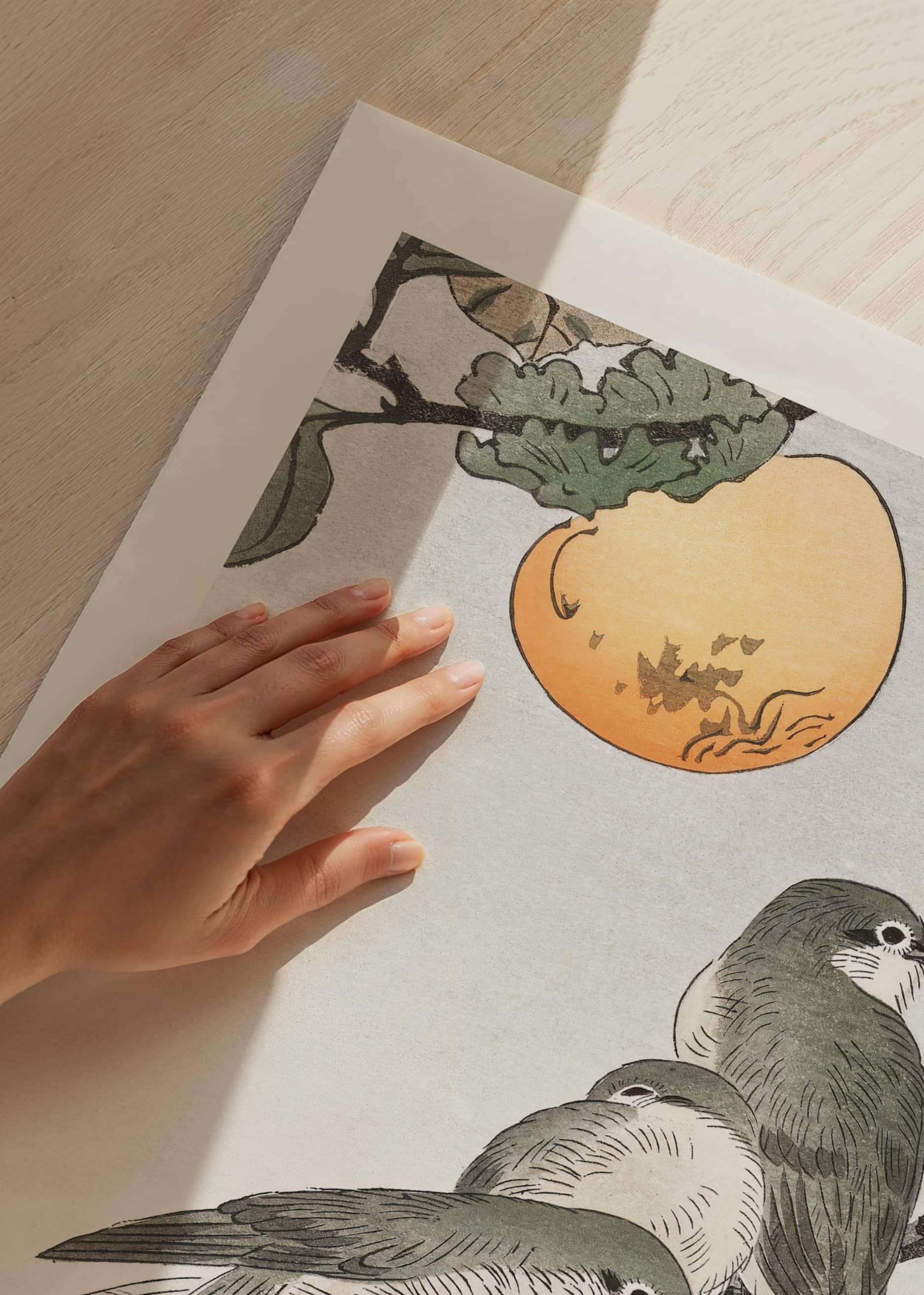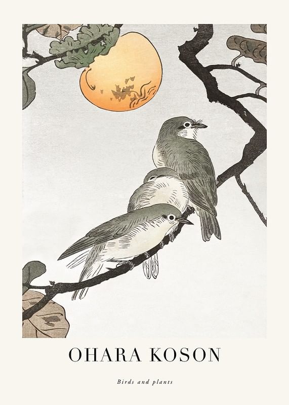 Zwei kleine Vögel sitzen nebeneinander auf einem dunklen Ast vor hellem Hintergrund, mit einer großen orangefarbenen Sonne oder einem Mond im Hintergrund und stilisierten Blättern ringsum. Das Motiv hat eine ruhige und detaillierte Ausstrahlung, die für Ohara Kosons Kunst charakteristisch ist. Ein zeitloses Poster, das sowohl Wohn- als auch Schlafzimmer mit japanischer Ästhetik verschönert.