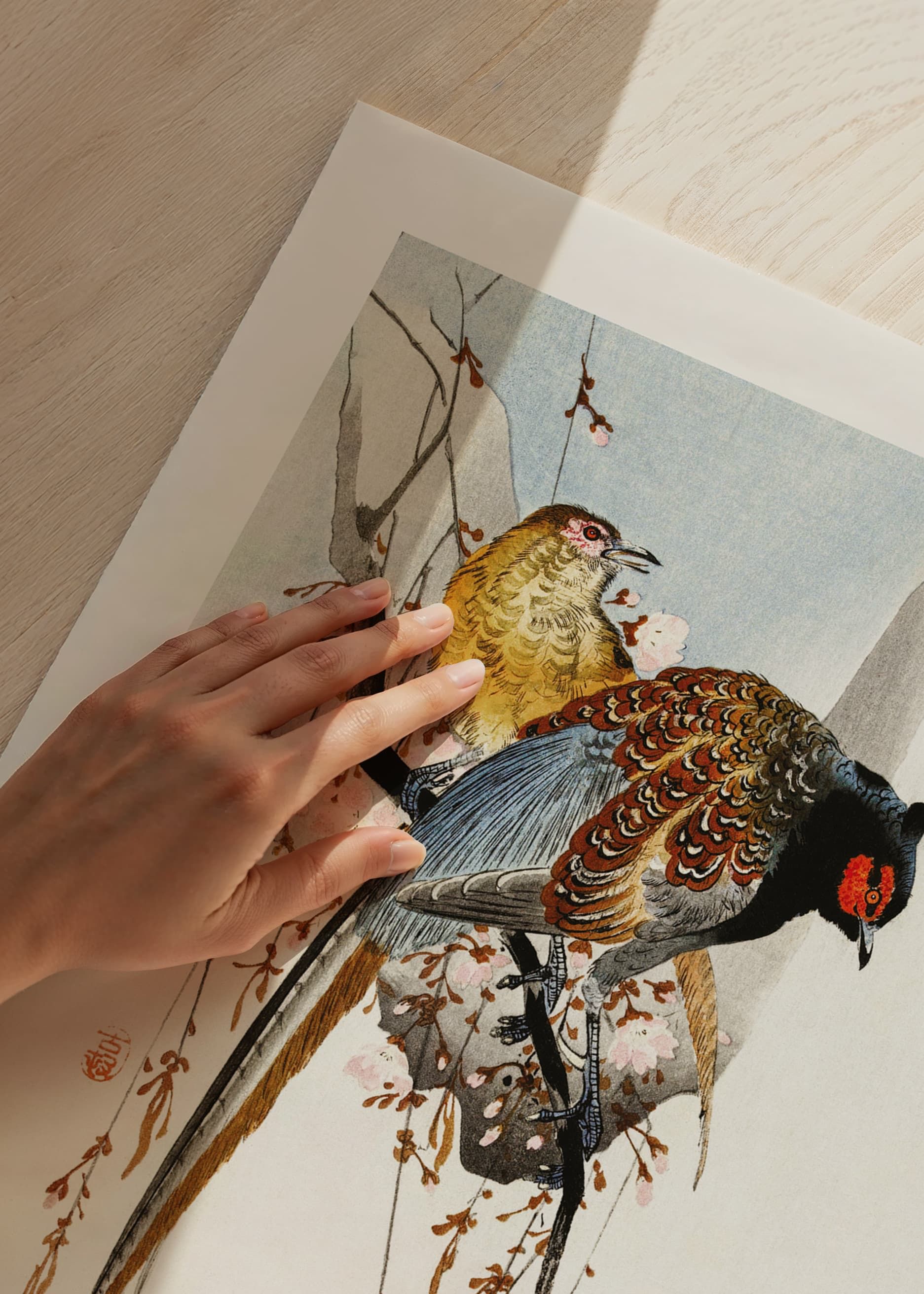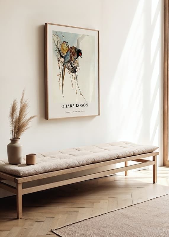 Zwei Fasane sitzen nebeneinander auf einem Ast mit blassrosa Pflaumenblüten vor hellem Hintergrund. Das detailreiche Gefieder in gedeckten Braun- und Blautönen ist typisch für Ohara Koson. Das Motiv wirkt zeitlos und verleiht jedem Wohn- oder Esszimmer eine japanische Ästhetik.