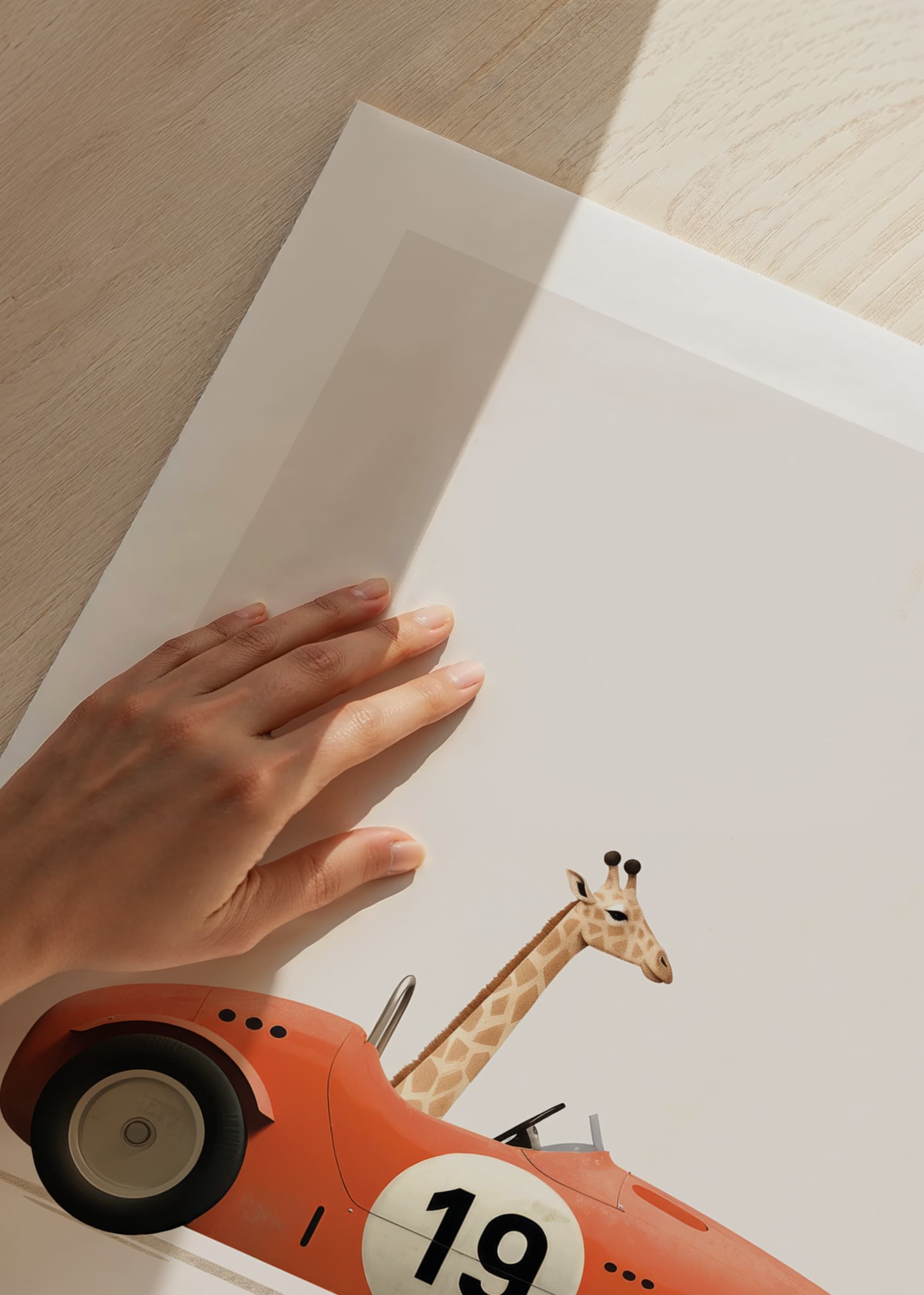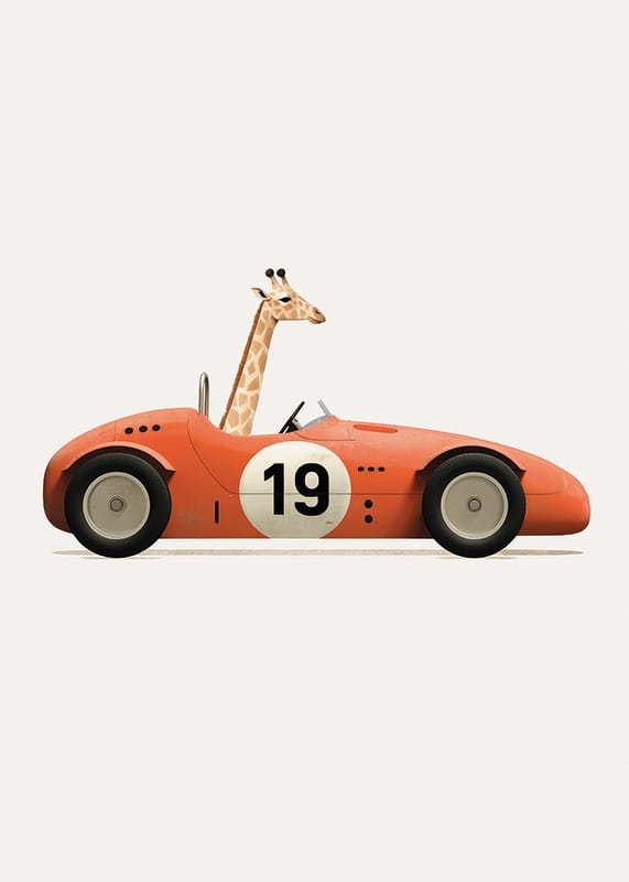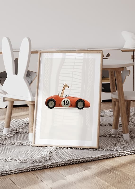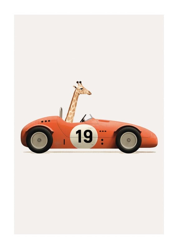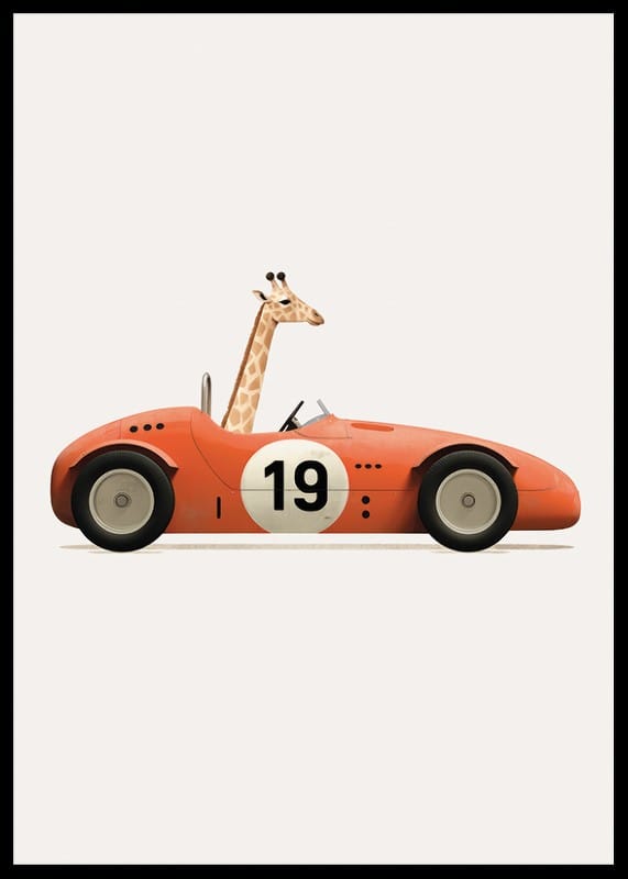 Das Motiv zeigt eine Cartoon-Giraffe, die am Steuer eines roten Spielzeugautos mit der Nummer 19 sitzt. Der helle Hintergrund hebt den langen Hals des Tieres und die klassische Form des Autos hervor. Verspielte Illustration, die dem Kinderzimmer eine fantasievolle Atmosphäre verleiht. Dieses Poster passt perfekt in eine verspielte Umgebung.