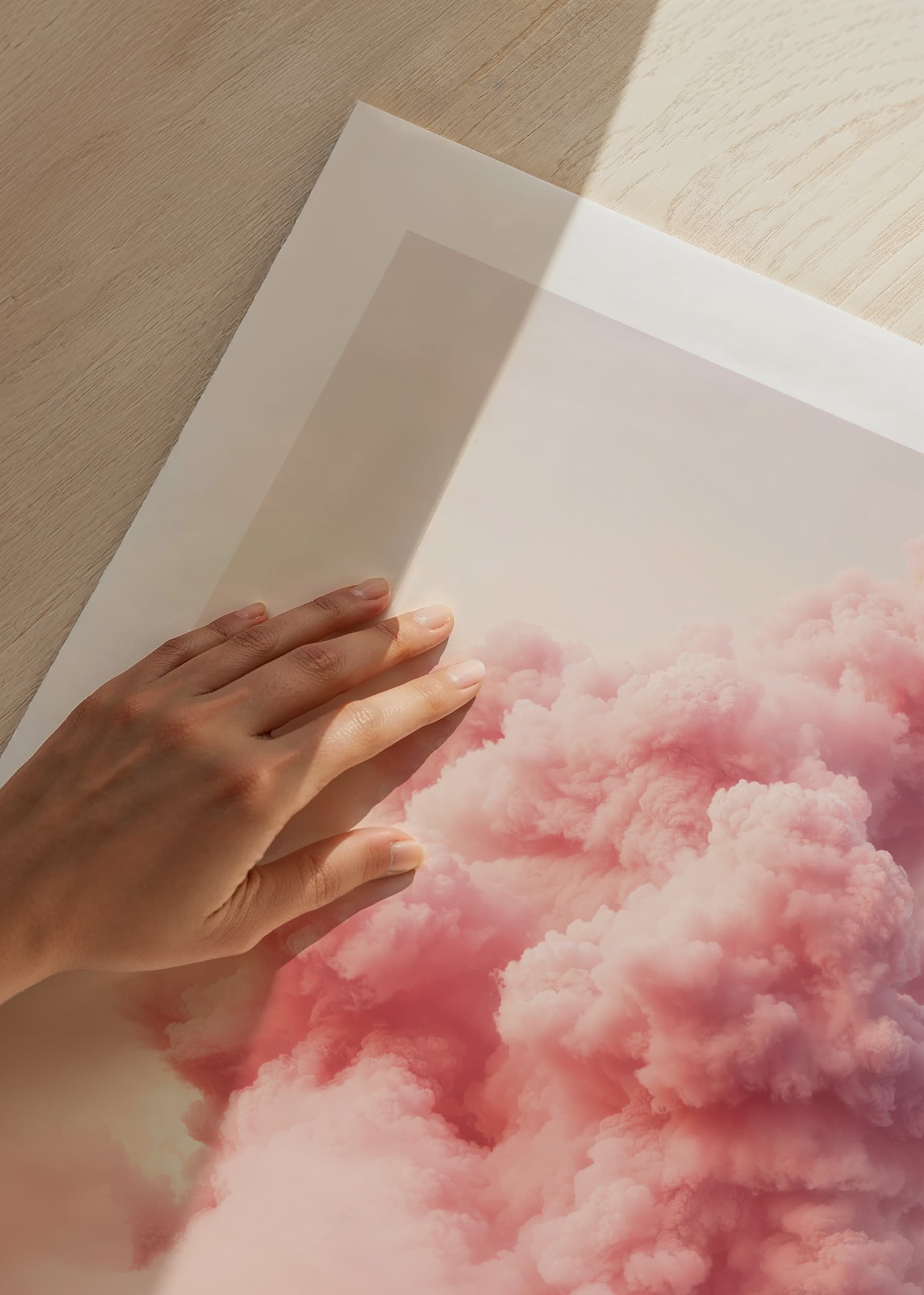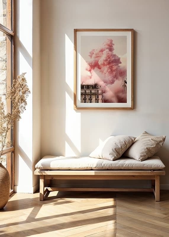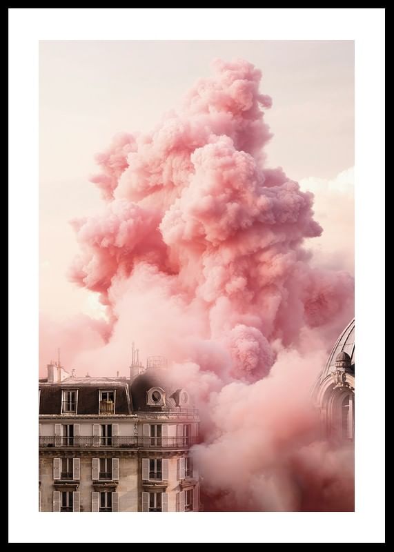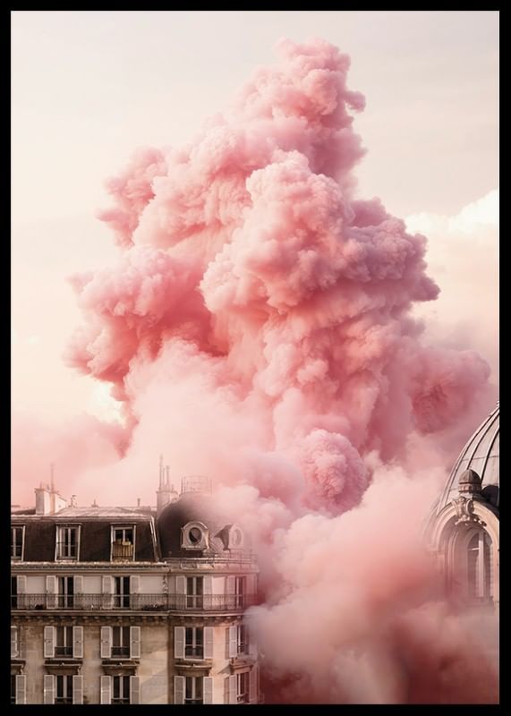 Die Skyline der Stadt am Place de la Bastille zeigt klassische Pariser Gebäude und eine große rosa Wolke, die sich über den Dächern ausbreitet. Die sanften Rosatöne treffen auf die architektonischen Details und schaffen ein ausdrucksstarkes und surreales Motiv. Ein Poster, das Wohnzimmern, Schlafzimmern oder kreativen Umgebungen eine einzigartige Note verleiht.