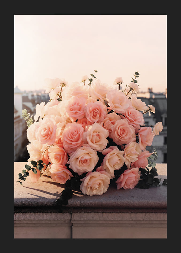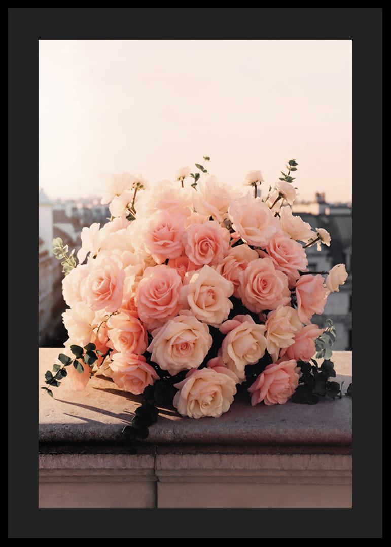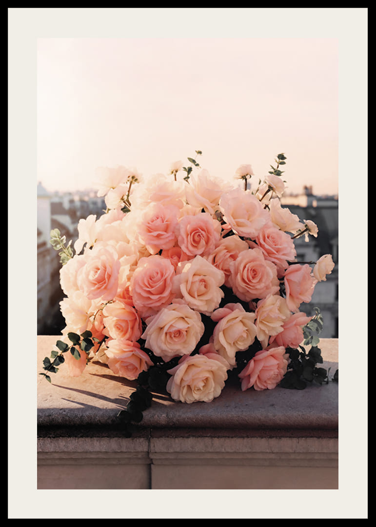Eine Sammlung blassrosa Rosen, arrangiert zu einem üppigen Strauß, ruht auf einem Steingeländer mit Blick auf eine Stadt im sanften Abendlicht. Die dichten Blütenköpfe haben cremeweiße Akzente und sind von grünen Blättern umgeben. Das Licht verleiht dem Motiv eine warme Ausstrahlung und lässt das Poster sowohl im Wohnzimmer als auch im Schlafzimmer gleichermaßen schön wirken.