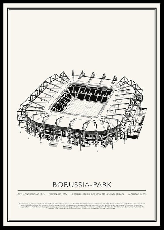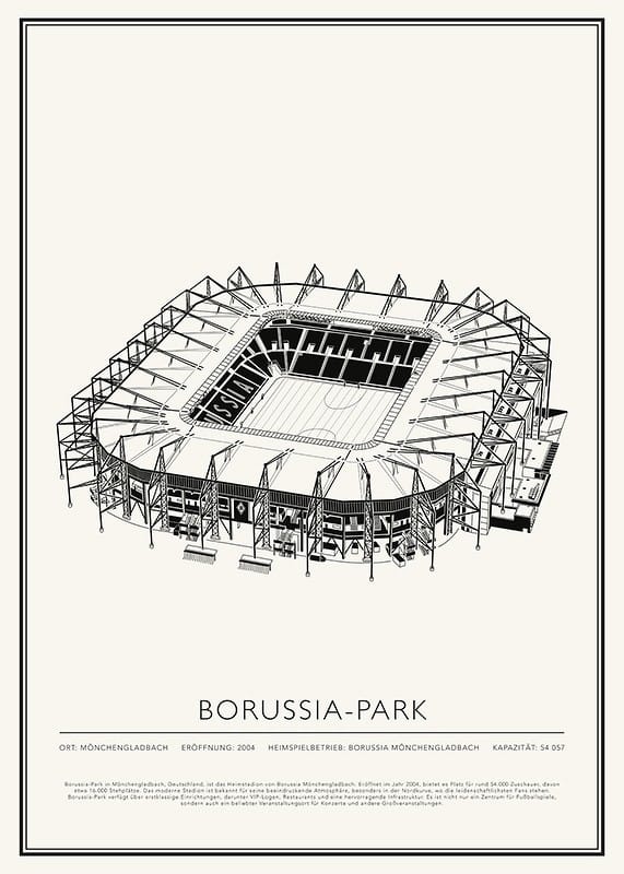 Borussia-Park in Mönchengladbach, Deutschland, ist das Heimstadion von Borussia Mönchengladbach. Eröffnet im Jahr 2004, bietet es Platz für rund 54.000 Zuschauer, davon etwa 16.000 Stehplätze. Das moderne Stadion ist bekannt für seine beeindruckende Atmosphäre, besonders in der Nordkurve, wo die leidenschaftlichsten Fans stehen. Borussia-Park verfügt über erstklassige Einrichtungen, darunter VIP-Logen, Restaurants und eine hervorragende Infrastruktur. Es ist nicht nur ein Zentrum für Fußballspiele, sondern auch ein beliebter Veranstaltungsort für Konzerte und andere Großveranstaltungen.