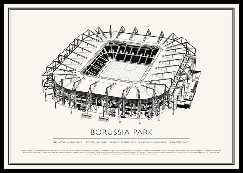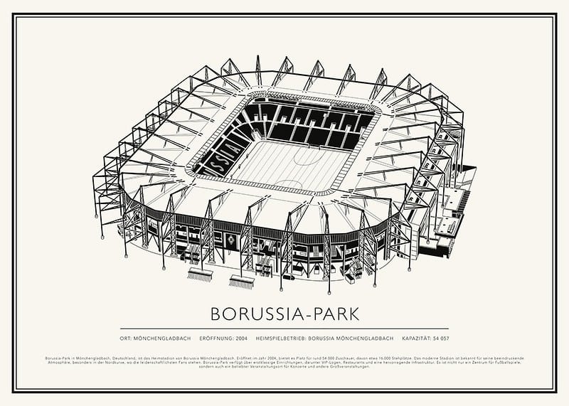Borussia-Park in Mönchengladbach, Deutschland, ist das Heimstadion von Borussia Mönchengladbach. Eröffnet im Jahr 2004, bietet es Platz für rund 54.000 Zuschauer, davon etwa 16.000 Stehplätze. Das moderne Stadion ist bekannt für seine beeindruckende Atmosphäre, besonders in der Nordkurve, wo die leidenschaftlichsten Fans stehen. Borussia-Park verfügt über erstklassige Einrichtungen, darunter VIP-Logen, Restaurants und eine hervorragende Infrastruktur. Es ist nicht nur ein Zentrum für Fußballspiele, sondern auch ein beliebter Veranstaltungsort für Konzerte und andere Großveranstaltungen.