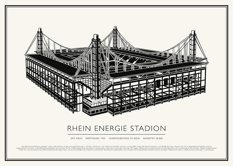 Das RheinEnergieStadion, gelegen in Köln, Deutschland, ist die Heimspielstätte des 1. FC Köln. Eröffnet im Jahr 1923 und mehrfach renoviert, zuletzt 2004, bietet das Stadion Platz für rund 50.000 Zuschauer. Bekannt für seine lebendige Atmosphäre und die leidenschaftlichen Fans, ist das RheinEnergieStadion ein zentraler Ort für Fußballbegeisterte. Das Stadion verfügt über moderne Einrichtungen, darunter VIP-Logen, Restaurants und Fanbereiche, die den Besuchern ein erstklassiges Erlebnis bieten. Neben Fußballspielen finden hier auch Konzerte und andere Großveranstaltungen statt, was die Vielseitigkeit des Stadions unterstreicht. Das RheinEnergieStadion ist ein Symbol für die Sporttradition Kölns und ein wichtiger Treffpunkt für Sport- und Kulturveranstaltungen in der Region.
