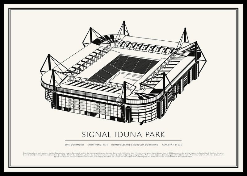 Signal Iduna Park, auch bekannt als Westfalenstadion, liegt in Dortmund, und ist die Heimspielstätte von Borussia Dortmund. Eröffnet im Jahr 1974, ist es mit einer Kapazität von über 81.000 Zuschauern das größte Stadion in Deutschland. Berühmt für seine beeindruckende Atmosphäre, insbesondere die "Gelbe Wand" der Südtribüne, bietet das Stadion ein unvergessliches Erlebnis an Spieltagen. Signal Iduna Park vereint moderne Einrichtungen mit traditionsreicher Architektur und hat zahlreiche bedeutende Spiele und Turniere, darunter Weltmeisterschaften, beherbergt. Es bleibt ein Symbol für die Leidenschaft und Hingabe der BVB-Fans und ein zentraler Ort im deutschen Fußball.