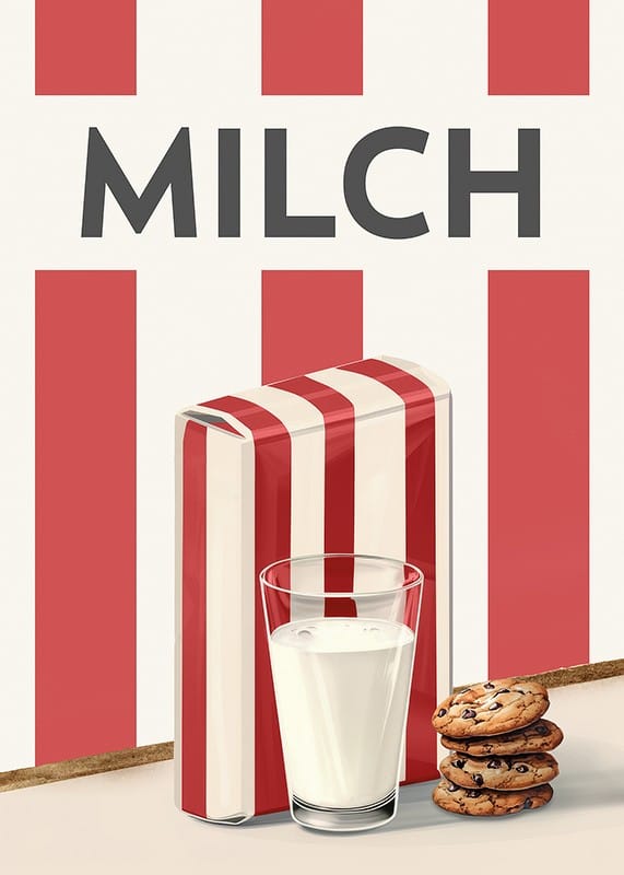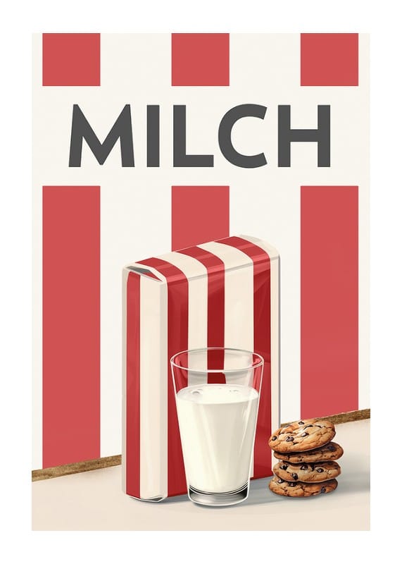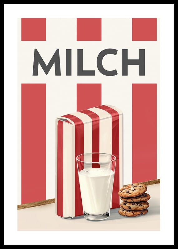 Erleben Sie skandinavische Schlichtheit und Retro-Charme mit diesem stilvollen Poster mit einem Aquarellbild von Milch. Diese Illustration fängt die Zeitlosigkeit eines Glases kalter Milch ein, serviert mit Schokoladenkeksen, neben einem Milchkarton, der mit klassischen roten und weißen Streifen verziert ist. Das minimalistische Design und die harmonische Farbpalette machen dieses Poster zu einem perfekten Detail in der Küche oder im Esszimmer. Eine Hommage an die Freuden des Alltags, die das Gefühl von Gemütlichkeit und guten Zeiten vermittelt.