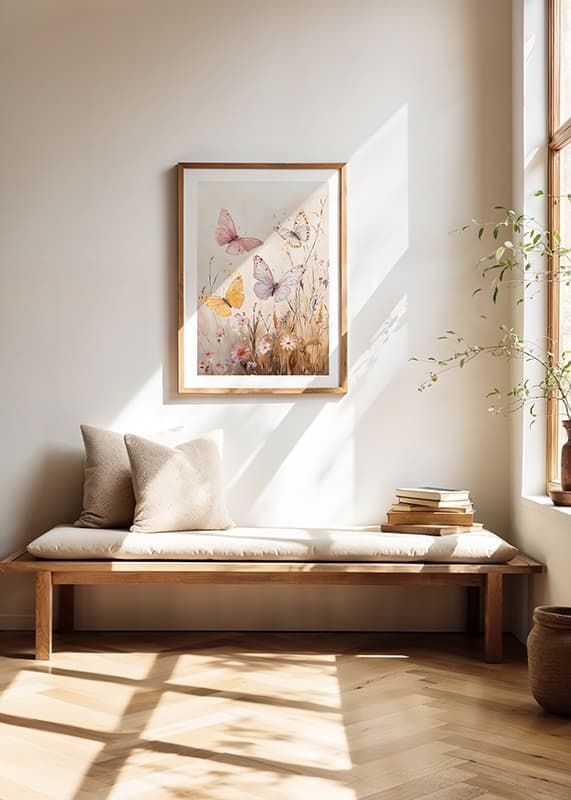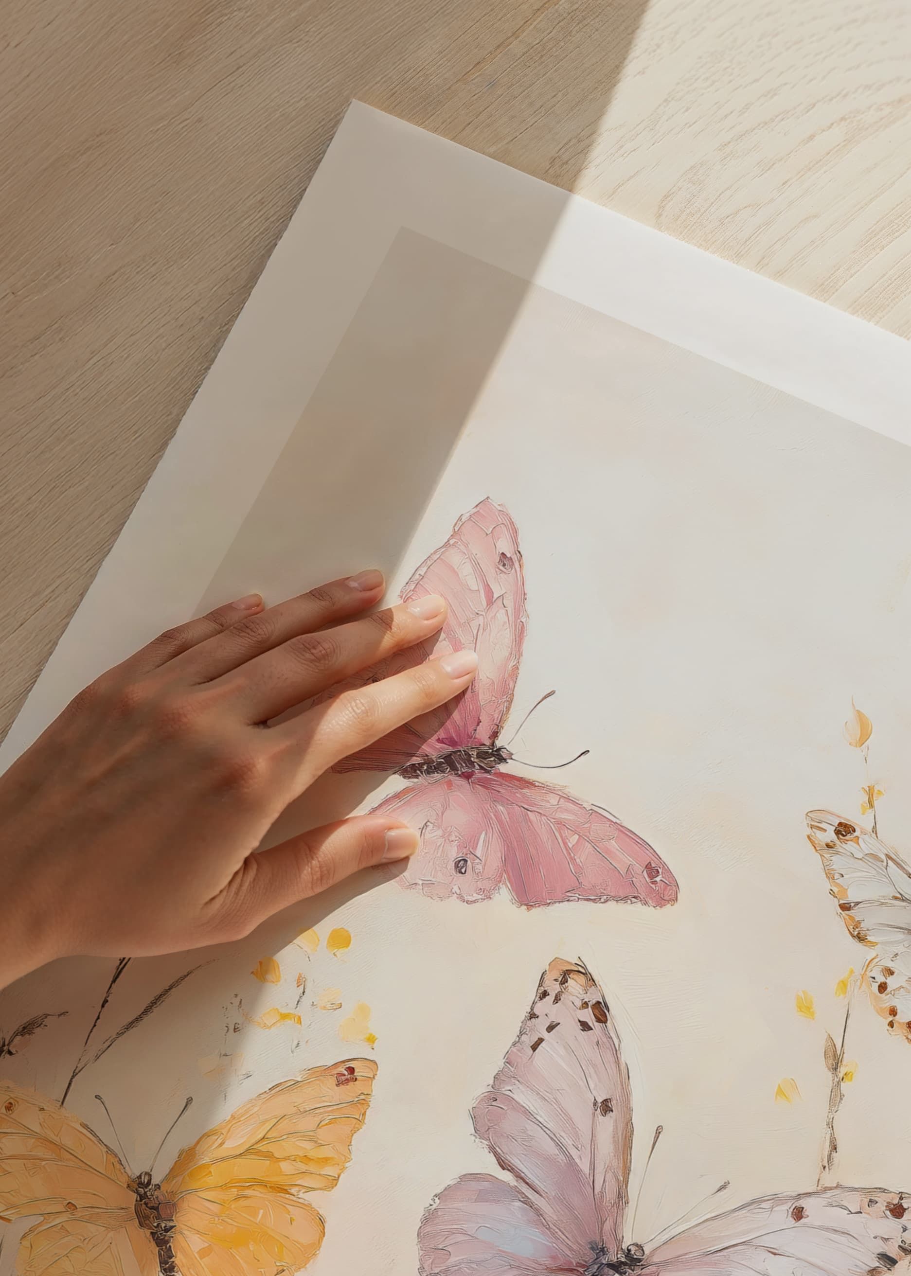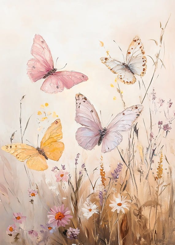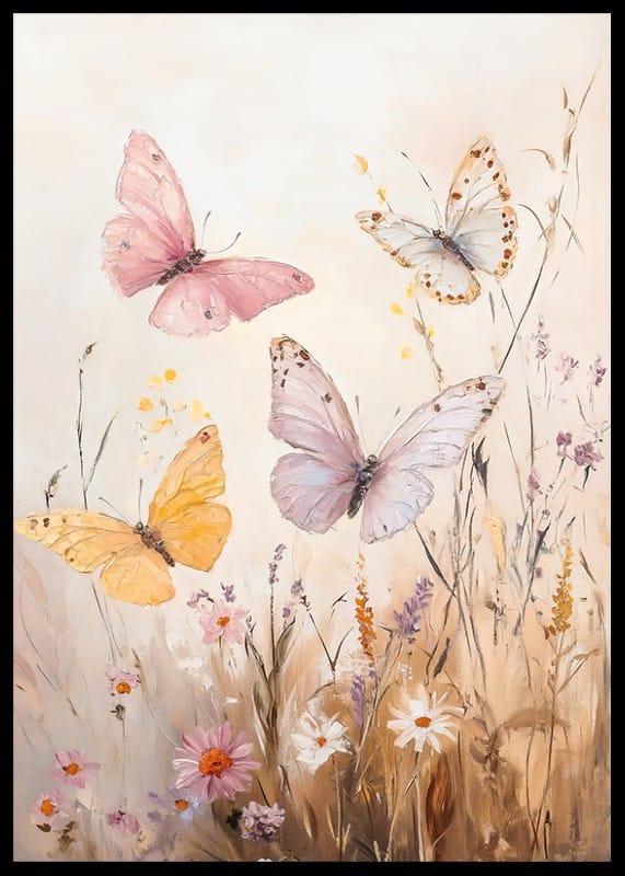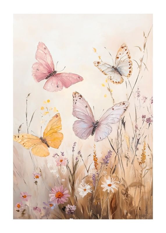Fangen Sie den Zauber der Natur mit diesem Poster ein, das Schmetterlinge in sanften Pastelltönen zeigt, die über eine blühende Wiese tanzen. Mit einer harmonischen Farbpalette und dezenten Details vermittelt das Bild ein Gefühl von Leichtigkeit und Freiheit. Dieses Poster eignet sich perfekt, um Ihrem Zuhause eine romantische und verträumte Atmosphäre zu verleihen und ist eine Hommage an die Eleganz der Natur und die Schönheit des Lebens.