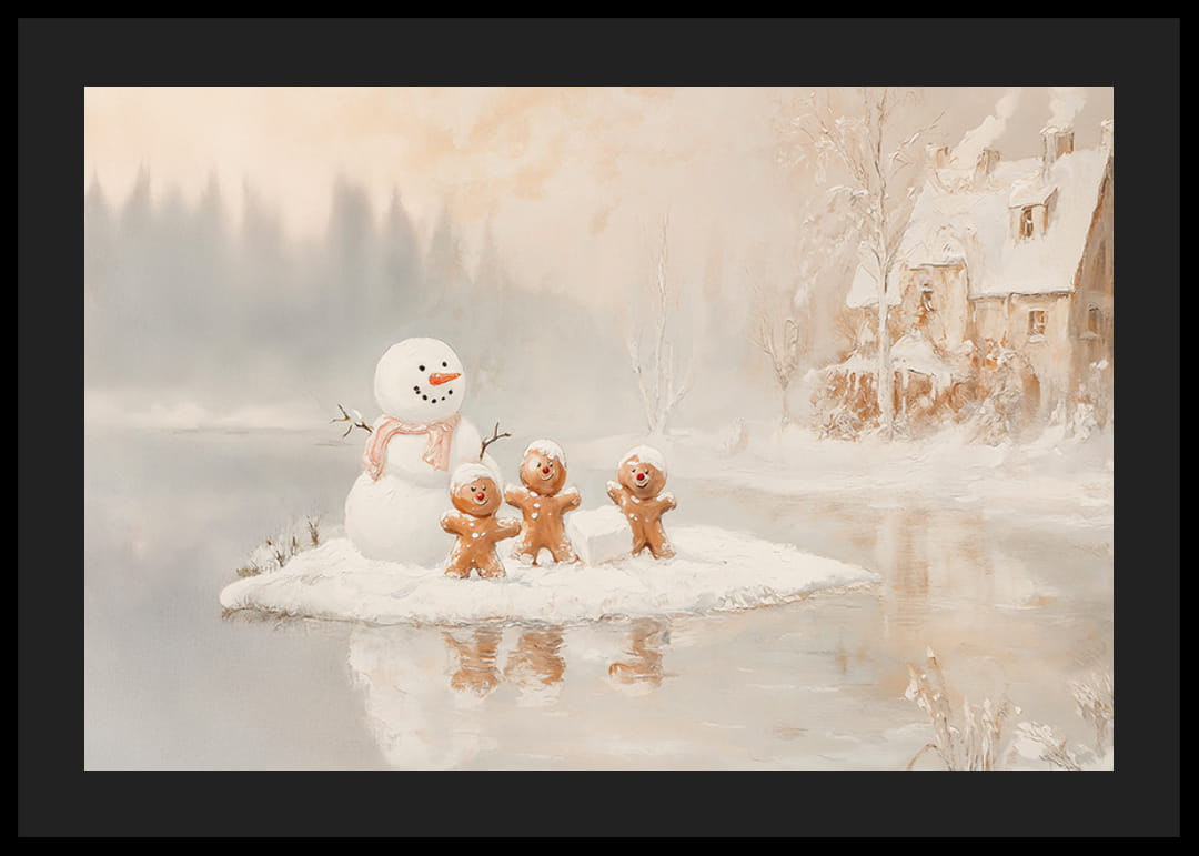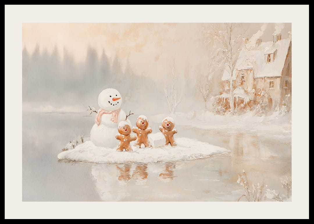 Füllen Sie Ihr Zuhause mit dem verspielten Charme des Winters mit diesem wunderbaren Poster, das einen Schneemann und drei glückliche Lebkuchenmänner auf einer kleinen verschneiten Insel an einem zugefrorenen See zeigt. Mit seinem fröhlichen Ausdruck und der friedlichen Winterumgebung fängt das Bild den Zauber der Feiertage und die Freude der Kindheit ein. Dieses Poster ist ideal, um ein warmes und gemütliches Gefühl zu verbreiten und wird ein wertvoller Bestandteil der Weihnachtsdekoration sein.