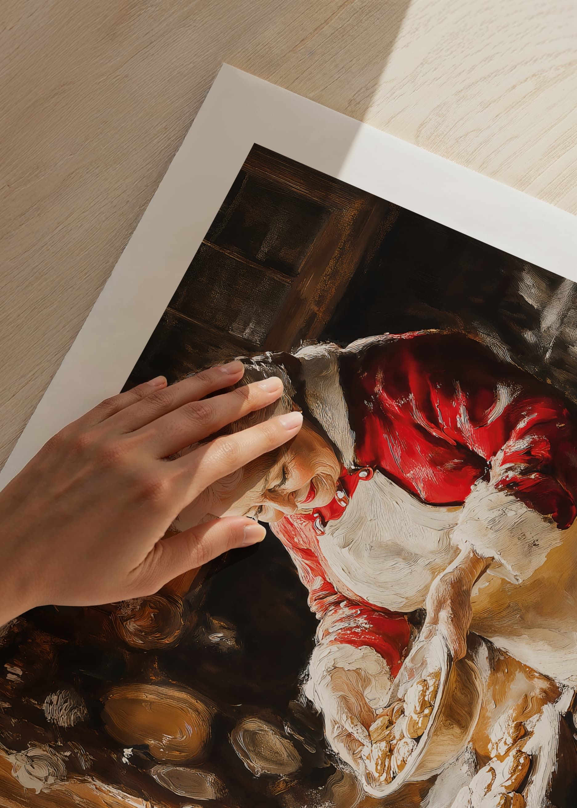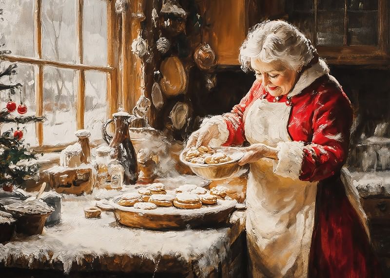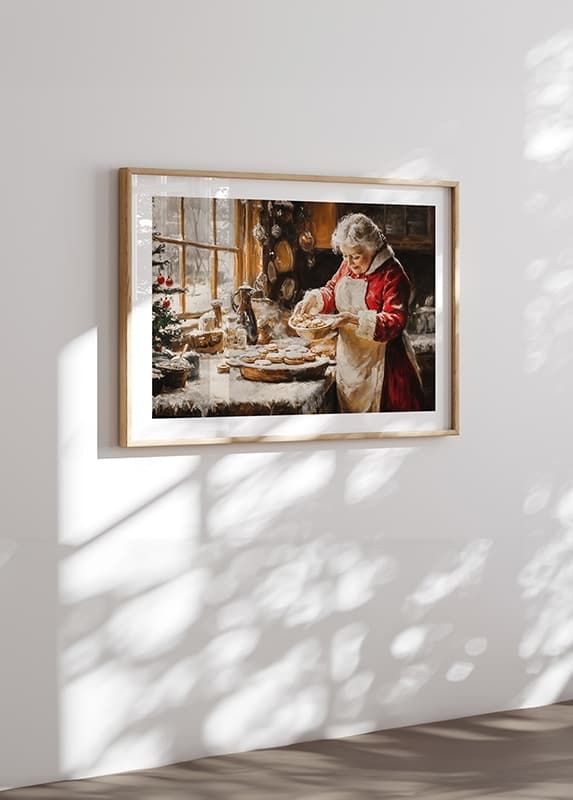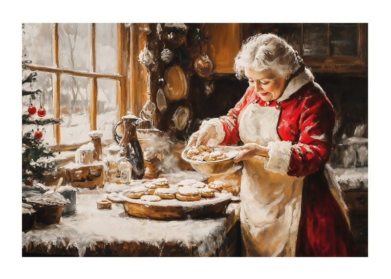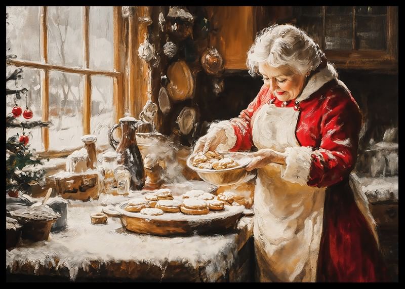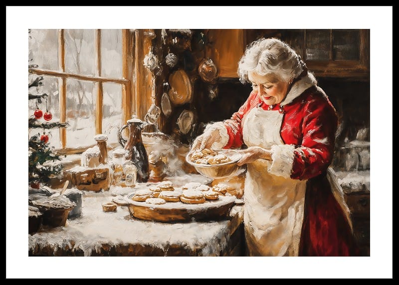 Erleben Sie den Zauber von Weihnachten in Ihrem Zuhause mit diesem bezaubernden Poster! Das Bild zeigt eine liebevolle ältere Dame, verkleidet als Frau Weihnachtsmann, die in einer warmen und gemütlichen Küche Kekse backt. Der Schnee liegt dicht vor dem Fenster, während Weihnachtsdekorationen und der Duft frisch gebackener Kekse den Raum erfüllen. Dieses Poster fängt die Essenz der heimeligen Weihnachtsatmosphäre ein und wird zu einer perfekten Dekoration, um diesen Winter Wärme und Nostalgie zu verbreiten.