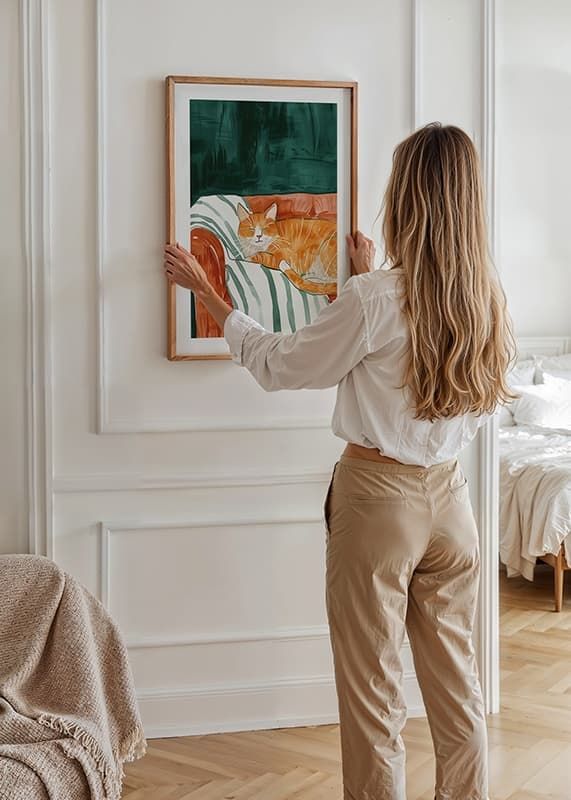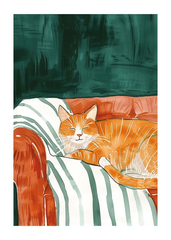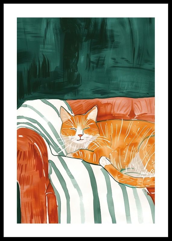 Dieses bezaubernde Poster zeigt eine schlafende orangefarbene Katze, die friedlich auf einem grün-weiß gestreiften Kissen in einem warmen braunen Sessel ruht. Die sanften Farben und der entspannte Ausdruck erzeugen ein ruhiges und heimeliges Gefühl, perfekt, um Ihrem Zuhause eine gemütliche und einladende Atmosphäre zu verleihen.
