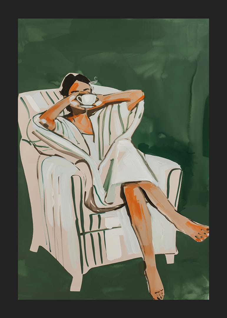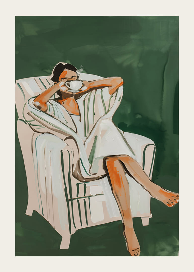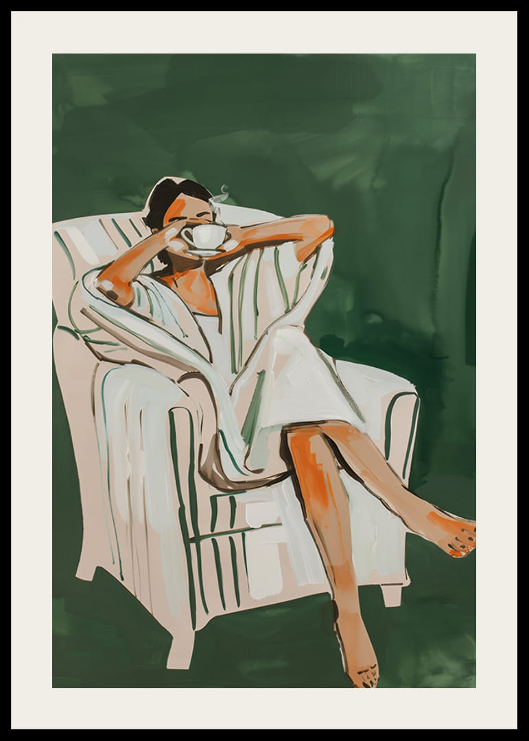 Halten Sie mit dieser eleganten Illustration das Gefühl eines perfekten Morgens fest. Eine Frau genießt eine dampfende Tasse Tee oder Kaffee, eingehüllt in einen weichen Bademantel, entspannt in einem bequemen Sessel. Mit harmonischen Farben und stilvollen Pinselstrichen erzeugt das Poster ein Gefühl der Ruhe und des Wohlbefindens.