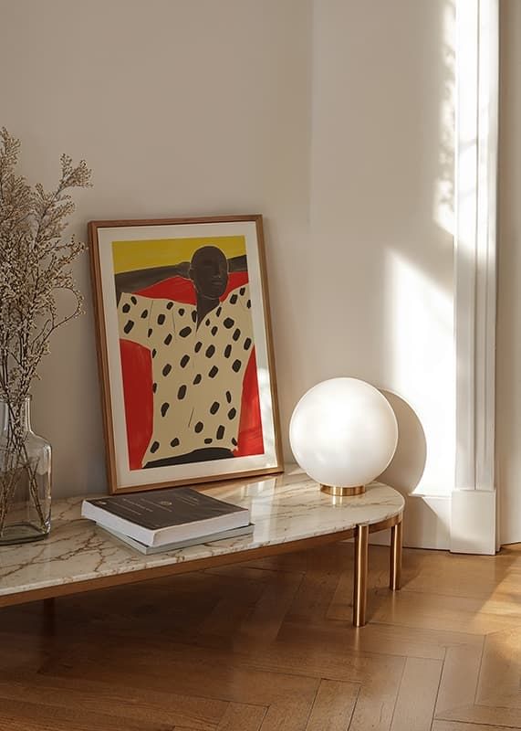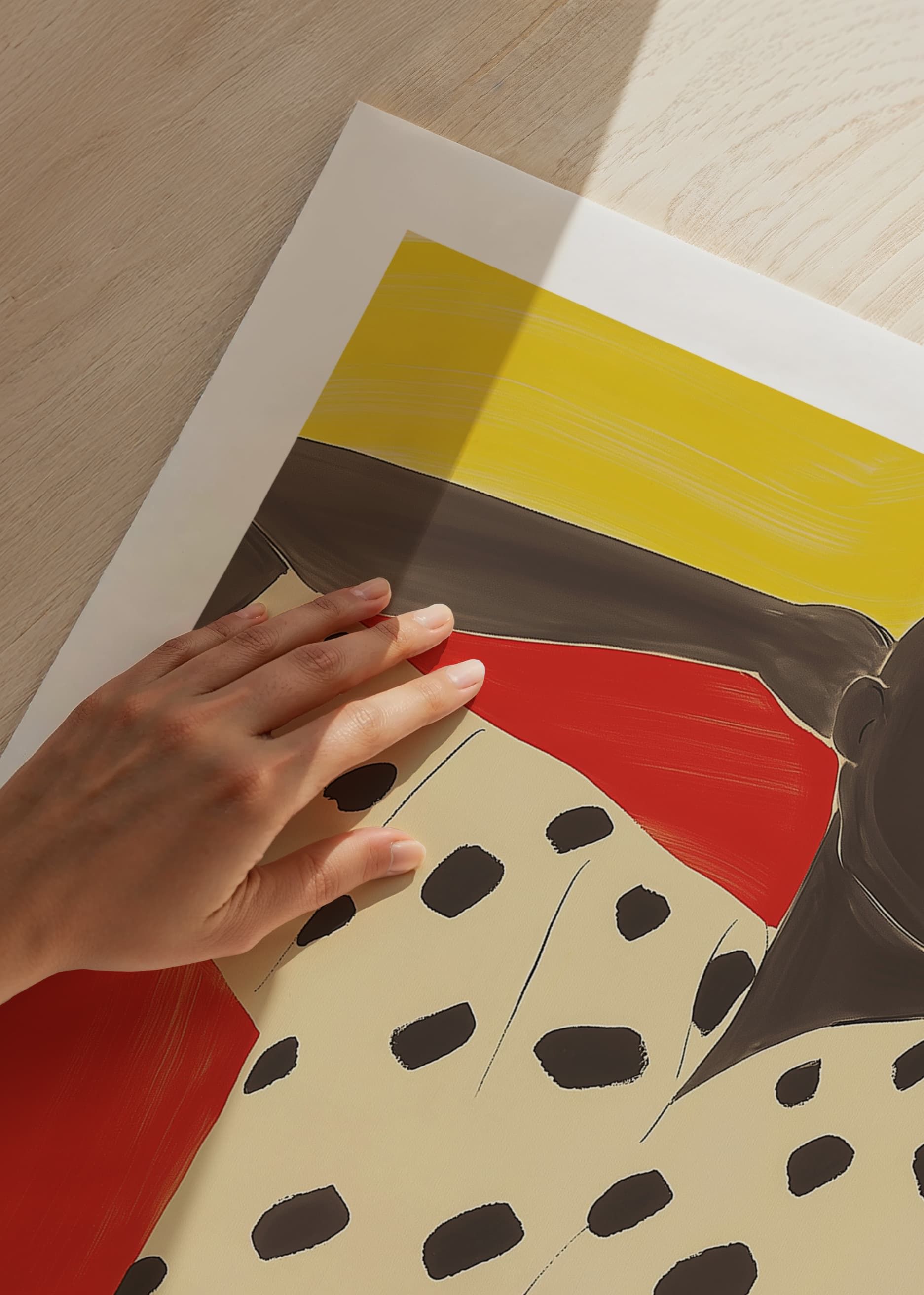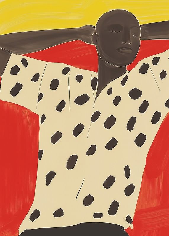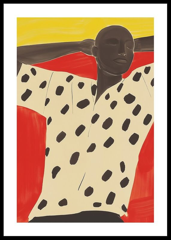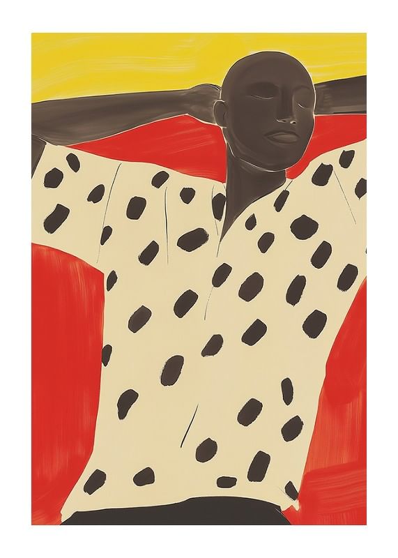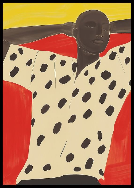 Tauchen Sie mit diesem bezaubernden Poster in eine Welt voller Farbe und Ausdruck ein! Eine elegante Figur in einem gepunkteten Hemd ruht vor einem Hintergrund aus leuchtendem Rot und Gelb und vermittelt ein Gefühl von Freiheit und Ruhe. Dieses Kunstwerk ist nicht nur ein optischer Genuss, sondern auch ein kraftvoller Ausdruck von Stil und Modernität.